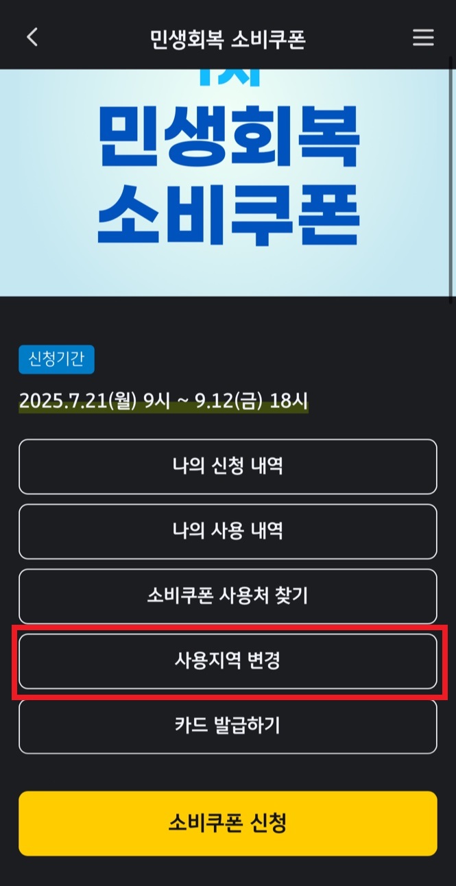 신용카드 또는 체크카드로 민생지원금을 수령하신 분들께서는 사용지역을 변경하고자 할 경우, 아래 절차를 따르시면 됩니다.